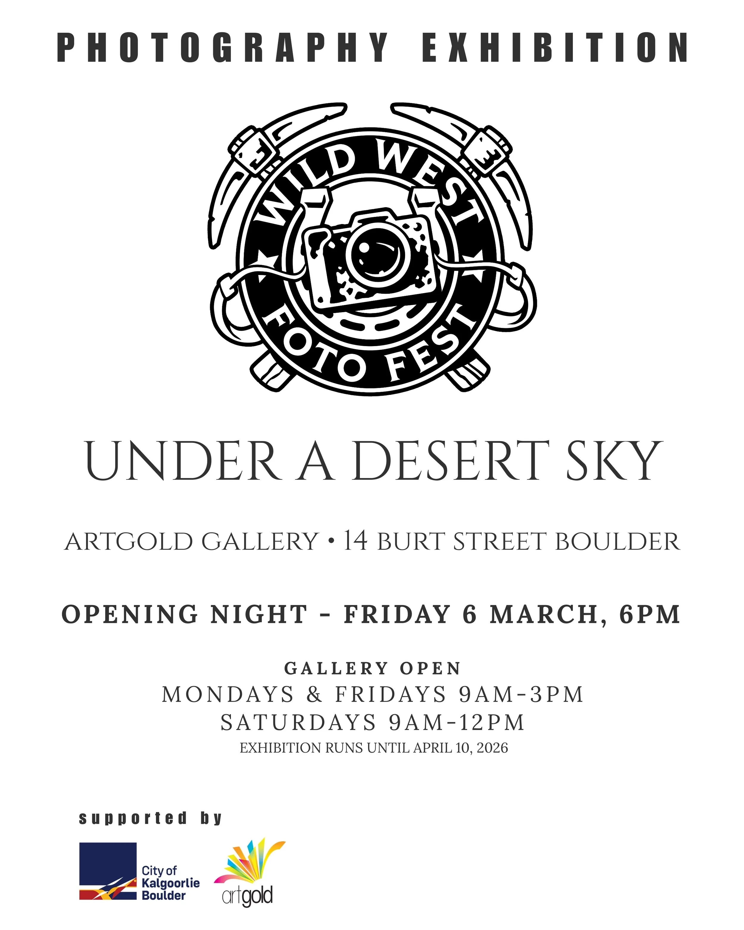 Under a Desert Sky is a group photography exhibition presented as part of Wild West Foto Fest, showcasing images made in and around the Goldfields region of Western Australia.